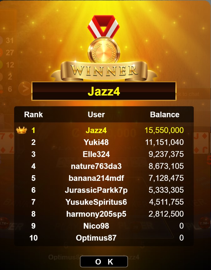 In conclusion, Jazz4, your achievement in clinching 1st place in baccarat has added an exciting chapter to the story of WANNAS Casino. Your dedication skill and the enthusiasm you bring to our community are truly commendable.