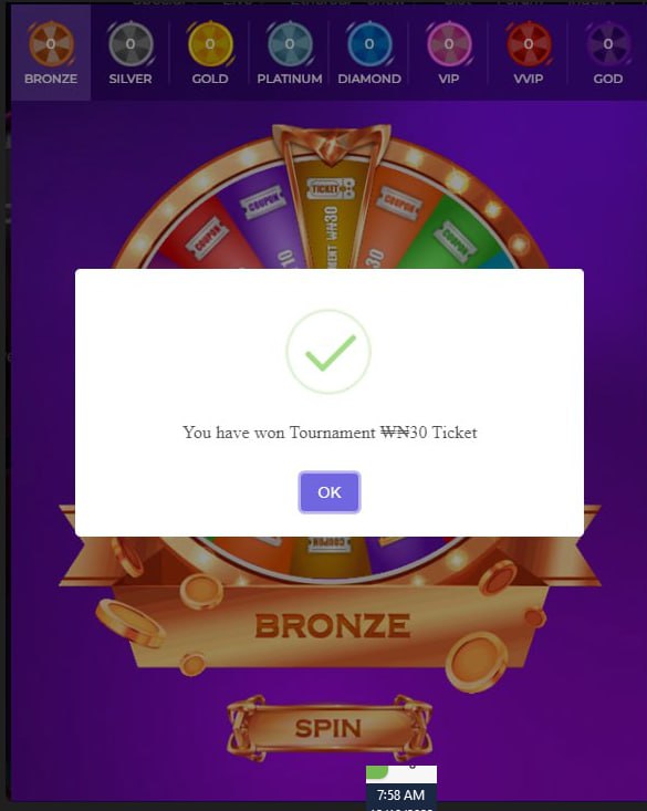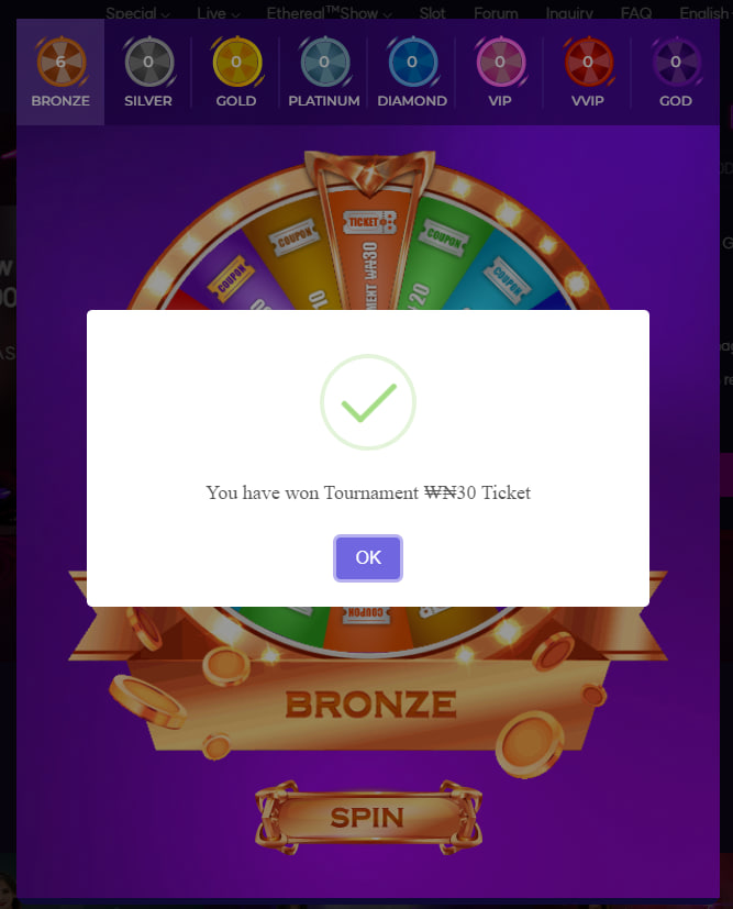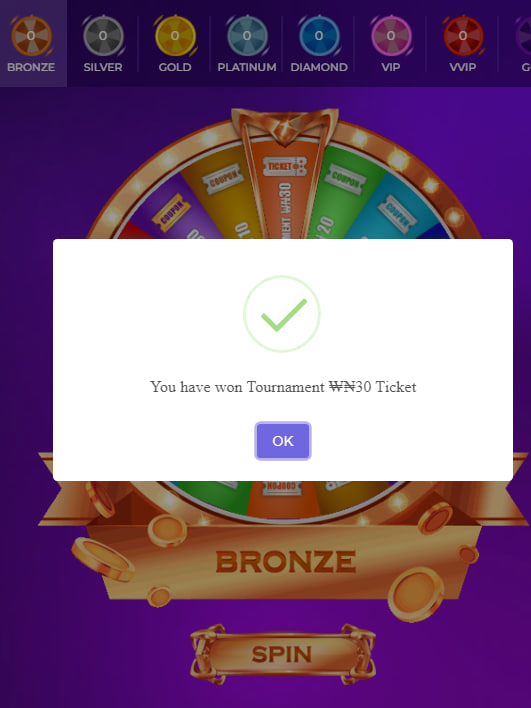 I was lucky enough to activate a free spin bonus, which increased the level of games. I held my breath as the imaginary wheel rotated. I was shocked when the wheel fell on the ₩N30 tournament ticket, enabling me to achieve the tournament's desired first rank!