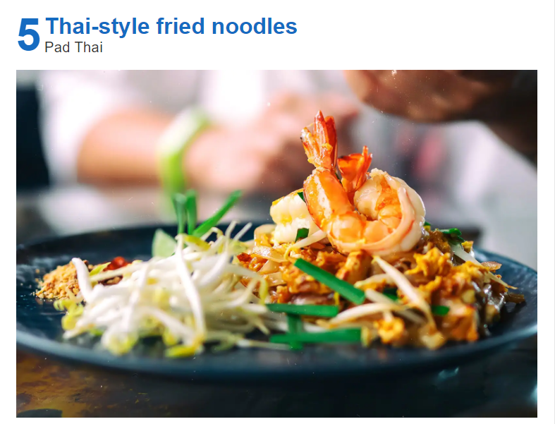 Pad Thai is one of Thailand’s most recognised dishes. Fistfuls of small, thin or wide noodles, along with crunchy beansprouts, onion, and egg are stir-fried in a searing hot wok. The dish is also flavoured with condiments such as fish sauce, dried shrimp, garlic or shallots, red chilli, and palm sugar. Pad Thai usually contains seafood – especially fresh shrimp, crab or squid – but some places serve it with chicken, beef or pork. The stir-fried noodles are often plated with a slice of lime wedge, crushed roasted peanuts, bean sprouts, and fresh herbs.